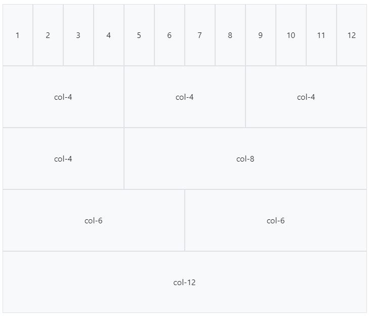 - 그리드의 중단점(break-point)는 최소 폭의 미디어쿼리를 기반으로 합니다. 예를들어 col-sm-4는 md, lg, xl에는 적용이되지만 xs에는 적용되지 않습니다.